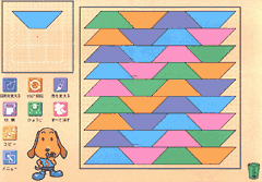 ○ | 本単元ではコンピュータを効果的に活用して(文渓堂「さんすうワールド」を使用)学習を進めていくことにした。本時では,自分でやってみたい形を画面に作成し,それを敷き詰める活動をコンピュータで意欲的に行うことによって,図形のいろいろな性質を発見し,その不思議さや美しさを感じさせていきたいと考えた。また,コンピュータを活用することで,次のような利点が考えられる。