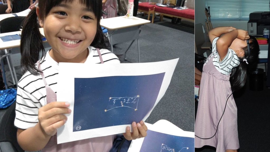 新興出版社啓林館大阪本社の近隣の子どもたちに学びの場を提供している「わくわく学習教室」。2023年7月25,26日の両日、こちらに参加している子どもたちに、星座カードを使った星座の学習とスマートグラスを使った「歩くプラネタリウム」を体験していただきました。みんな夢中で取り組んでいて、何度もリピート!「星座は国によってちがう!」「他の国の星座を知りたい!」など、子どもたちの率直な感想が寄せられました。あらためて最新のテクノロジーと学びの融合に大きな可能性を感じました!スマートグラスのテクノロジーはMiRu place様(大阪府)のご協力をいただきました。https://miruplace.com/top