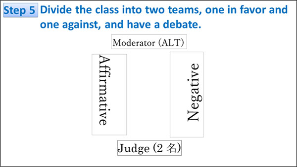 この時には,Moderator(司会者)役としてALTの協力を得て行うと英語を使用する必然性が増し,さらに盛り上がる。また,生徒2名にJudgeをさせ,最後の勝敗の発表と簡単なコメントを言わせると良いだろう(図6)。