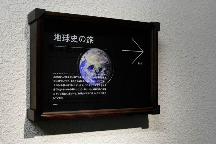 以下の10のてんじ室と地球史の旅というろうかにてんじされた標本箱が常設(じょうせつ)てんで見られます。
