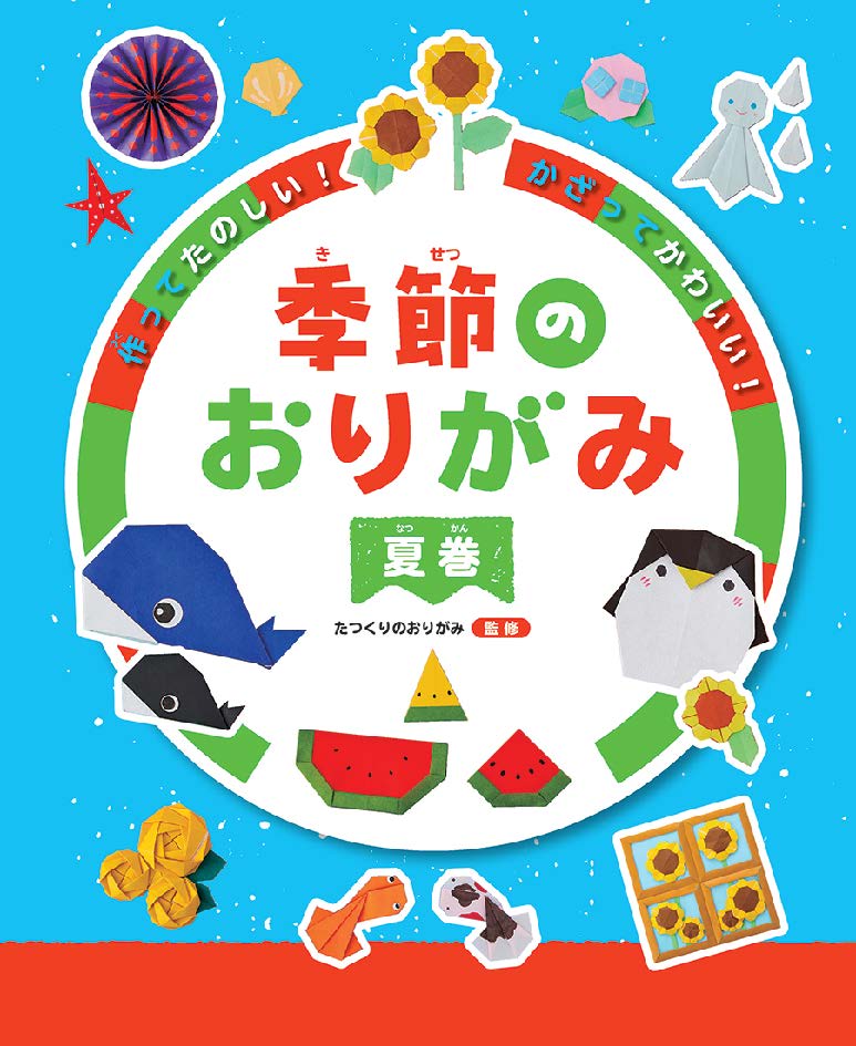 「夏巻」では、6~8月にちなんだ作品を15点紹介します。学校の掲示などに使えそうな「てるてるぼうずとしずく」や、表情をつけて楽しめる「カエル」や「ペンギン」、色や柄を工夫できる「うちわ」「ちょうちん」「花火」など、バラエティのある作品群です。巻末のかざりページでは、簡単に作成できるリースとフレームの折り方を紹介。それを用いてモビールをつくるなど、楽しく折った作品を見栄えあるかざりにしていく工夫を掲載しています。