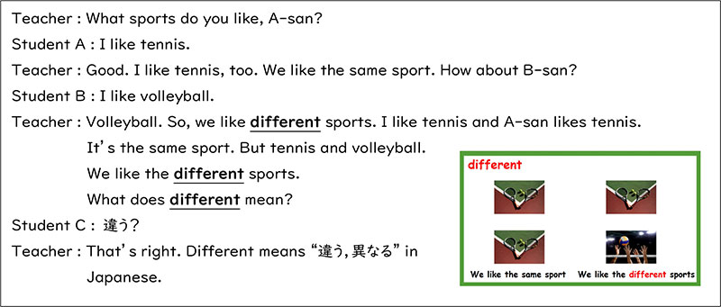 また,differentという単語では,次のようなやり取りが考えられます。生徒たちはsameが既習単語です。