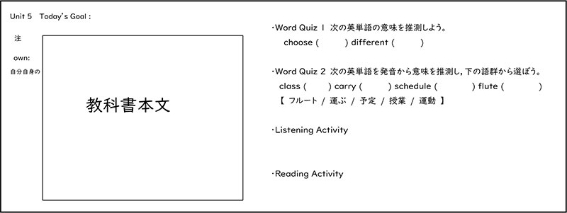 教科書の本文を扱う際は,①~③の新出単語の導入を踏まえたワークシートを作成して生徒に配布しています。Word Quiz 1(文脈から推測)・2(発音から推測)に取り組んだ後は,左の本文を見ない状態で英文を聞き,内容理解の問題(Listening Activity)を解きます。その後は,本文を読みながら,内容理解の問題(Reading Activity)を解きます。そして,最後に新出単語をまとめたワードリストを配布します。