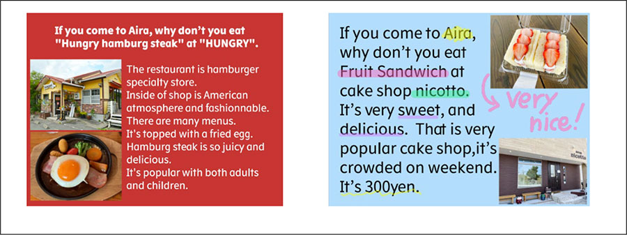 以下の資料は,「姶良のせっかくグルメを紹介しよう」という課題の生徒作品である。テレビ番組「バナナマンのせっかくグルメ」のレポーターがもしも姶良市に来たらどんなお勧めグルメを紹介するかという設定で,単元の題材である「食文化」というテーマに触れながら言語材料としてIf やWhenなどの接続詞,I think~を用いて自分の考えを表現する方法などを活用してプレゼンテーションを作成させた。単元の終わりには,「話すこと(発表)」と連動させるために,実際のテレビ番組の一場面を想定したスキットで何組かに発表してもらった。テレビ番組のパロディ的活動は,生徒たちも活動のイメージがしやすいため意欲的に取り組む様子が見られる。
