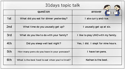 帯活動として31日分のtopicを用意し,日付と同じ番号のテーマについてペアで対話をする活動に取り組む。(資料2)相手の質問にスムーズに答えたり,質問を返したりするトレーニングを継続し,即興的に会話を続けることができるようにする。