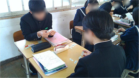 「話すこと(やりとり)」を目的とした対話的活動をするときには,何について話すのか(トピック)を大切にしている。クラスメイトとして相手の知らなかったことを共有できるような話題になるようにトピックカードを用意して,生徒が話しがちな部活動や好きな食べ物に話題が偏らない工夫をすることで使用語彙を広げさせ,さまざまな語に出会うように仕向けている。