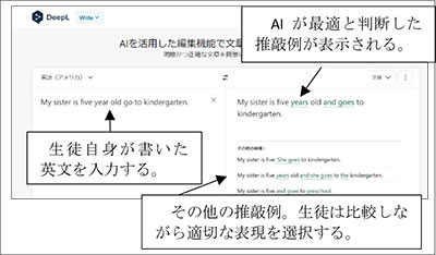 「書く活動」において,生成AIアプリ「DeepL 翻訳」および「DeepL Write」を積極的に活用している。自分らしい表現を達成するために既習の語彙にこだわらず,場面に応じた適切な語彙を学習者が自ら選択できるように「DeepL翻訳」を辞書として活用する。また,英文を組み立てることに難しさを感じている生徒も多いことから,生徒自身が書いた英文を推敲したり,よりよい表現を選択したりしながら英文を完成させるために「DeepL Write」を使用する。「DeepL Write」はテキストを入力すると推敲のヒントが得られるアプリケーションである。生徒に多い文法や句読点の間違いを修正してくれるだけでなく,生徒の誤りを瞬時に判断しいくつかの推敲候補を提案してくれる。生徒たちは推敲された英文を見ながら,文法上の誤りについて「また,三人称単数のsをつけ忘れてしまった」「過去形に直し忘れていた」などの気づきを得たり,提示された推敲候補を比較しながら「なぜinではなくてonなのだろうか」「どちらの表現がより自分の気持ちに近いだろうか」などの個別の疑問を持ち解決したりすることで学びを深めていくことができる。