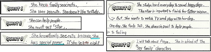 TOYO QUEST終盤の原稿を書く際には,INDIVIDUAL TIME(個別時間)とCOLLABORATION TIME(協働時間)に時間を区切った。INDIVIDUAL TIME(個別時間)には,各QUESTにおいて復習した文法や表現を使い,自力で英文を書く活動を行った。英語を苦手とする生徒も,ゲーム内で活用したカードやワークシートを利用して自力で書くことができた。COLLABORATION TIME(協働時間)には,グループを作り,自分が書いた文の正しさを実感したり,間違いを修正しあったり,自分の言いたいことと相手の解釈に差異がないかを確認したりするやり取りが見られた。これらの時間を設けたことで,生徒たちは個別に考えた英文をもとに正しい英文かどうかを確認したり,誤っている英文を一緒に直したりして,正しい英文を書くことができるようになったと感じた。