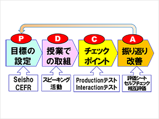 まず,公式戦としてのパフォーマンステストについてですが,英語科で作成したスピーキング(発表・やり取り)の到達目標【PLAN】(本校では“Seisho-CEFR”と呼んでいます),テストに向けて帯学習で取り組むワークシート【DO】,テスト問題と評価用ルーブリック【CHECK】,そして生徒がフィードバックするための評価シート及び自己評価・相互評価【ACTION】を紹介させていただきます。英語科でこの取組を始めたきっかけは,生徒がスピーキングに関する日ごろの学習成果を試し,自分の到達度をチェックする機会をもつことで,スピーキング活動への生徒のモチベーションを高めたい,そして,生徒が即興性のある英語発信力を身に付けてほしいという思いからでした。取組のポイントは,下の図のように,一連の流れがPDCAサイクルになっており,指導と評価の一体化を図っている点,そして,スピーキングテストをProduction(発表)とInteraction(やり取り)に分けて実施し,評価も別々に行う点です。また,生徒が少しでもリアル感をもってスピーキングテストに取り組むことができるように,テストの素材には,生徒の身近な話題や地域とつながりのある題材を選んで作成しています。本校で実際に使用したものを以下にリンクしていますので参考にしていただければ思います。