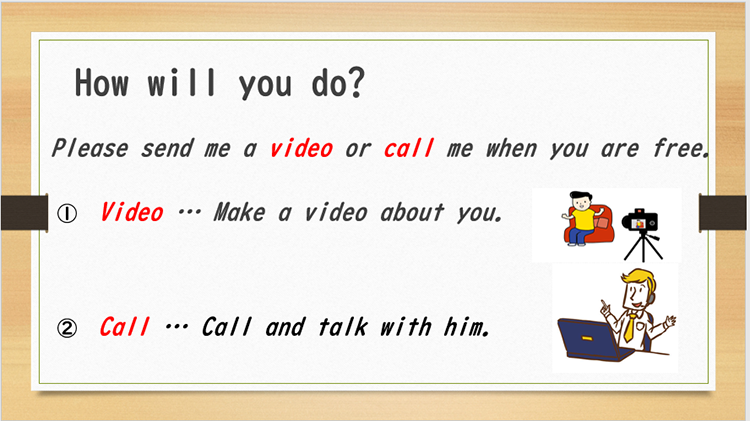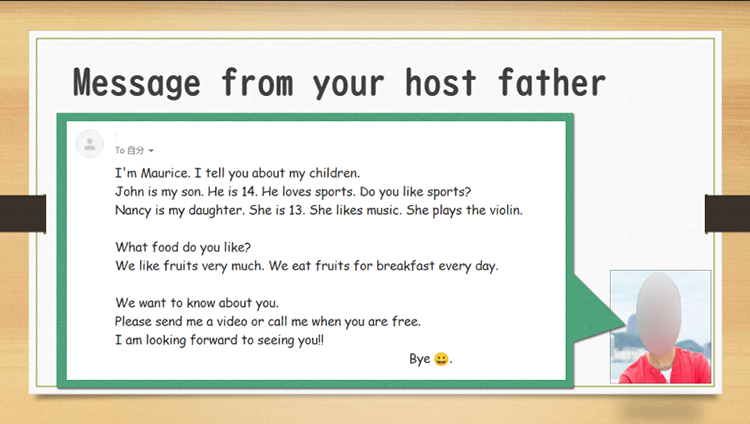 生徒とのやりとり,生徒同士での話し合いを経て,目的や他者意識等を全体で把握する時間を設けた。こちらは生徒が英文を作成する前に提示したものである。またメール内にもあるが,発表方法についても生徒と共通理解を図った。評価を一本化するために,「①自己紹介ビデオを撮る」は全員の課題とした。また「②オンライン通話を行う」は希望者とホストファザー役のALTが選出した生徒とした。