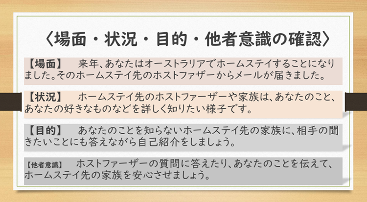 まず初めに,生徒が誰に自己紹介をするのかを伝えた。今単元での設定は「ホームステイ先の家族」への自己紹介とした。他者意識を持たせることで,適切な英文に仕上げられると考え,また発表内容や方法についても,相手からメールが来るという流れにし,各個人で読み取らせて思考・判断・表現させたいというねらいを持った。