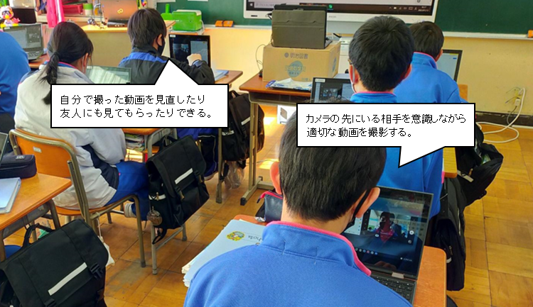 パフォーマンステストは,クラス全体の前で行ったり,教員と生徒で1対1で行ったりすることが以前までは多かった。一人一台タブレットが導入されたことで,「動画による提出」の選択肢も得られた。これは,活動を何度も粘り強く挑戦することができる,自分で振り返りながら調整を入れられることなど多くのメリットがある。今回はカメラの先に相手がいることをしっかり意識させることで,リアルの発表に近い雰囲気を出すことができたように感じた。