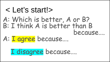 また,学習内容に「ディベート」が盛り込まれている教科書もある。ディベートは自分の考えを明確に表現すること,相手の考えを理解することの双方が深く関連し,Small Talkで養った力をフルに活用することができると考えた。