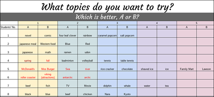 しかし,繰り返しディベートを行うとマンネリ化してしまう。また,ディベートのテーマも教員だけで考えるのには限界がある。そのため,生徒からテーマを募集することで,生徒が興味関心を持って活動ができる身近な話題を常に使うことができると考えた。