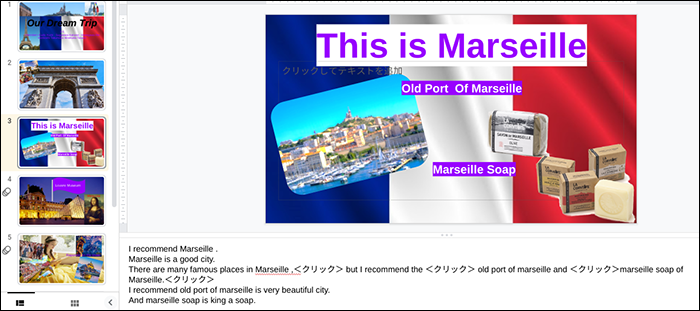 更に発表用スライド作成に関しても共同編集で進めていくことで全体の流れが把握できるため,最終的な確認の時間が省け,グループ練習の時間が短縮できる(資料6)。