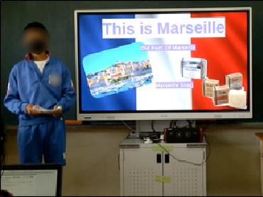 単元の最後には作成したスライドを大型提示機に投影してプレゼンテーションを行っていく(資料7)。プレゼンをするのに視覚資料は欠かせないものであるため,ここまでの過程で一貫してデジタルで行なうことが効率的である。何より,自分でまとめたものが学級全体の前で表現できる機会があることが,生徒の英語学習のさらなる意欲喚起に繋がっていくと考える。