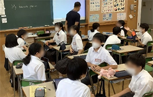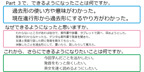 授業の終わりに一人1台端末を活用した学習の振り返りを行わせることで,生徒の主体的に学習に取り組む態度を育成している。一人1台端末で,生徒一人一人に振り返りシートを配布し,記録・蓄積させている。その日の授業で,「何ができるようになったか。」,「なぜ,できるようになったと思うか。」,「さらにできるようになりたいことは何か。」という項目に沿って,生徒に学習を振り返らせ,生徒自身で学習を調整する力を養っている。一人1台端末内で,記録し,保存することで,生徒は,授業内外問わず,学習を振り返ったり,自らの成長を実感したりすることができていた。