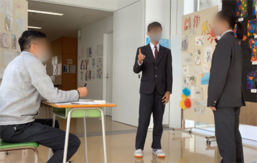 帯活動を継続的に行った後,生徒はALTと一対一で会話をしたり,ALTの前で生徒同士でやり取りしたりすることで,帯活動で培った成果を発揮する場面を設けている。