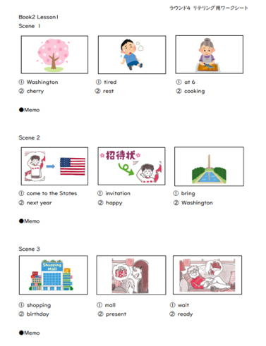 | ラウンド1 | リスニングによる内容理解・音と文字の一致 | 1 | 音声・イラスト・T/F Question・並び替えプリント |