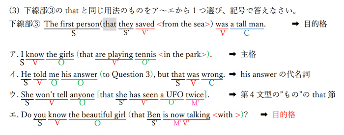 また,品詞に関する知識に中学生の内から触れておくことで,多くの高校生が苦手とする関係詞の単元の説明に時間がかかり過ぎることはなかった。私の担当する学年ではS(主語),V(動詞),O(目的語),C(補語),M(修飾語)に加え,( )で形容詞句(節),< >で副詞(句)節,[ ]で名詞節を表して,それぞれの語句が文中において何の役割をしているかを考えさせた。本格的にこれらの記号を使っての説明をしたのは中学2年次の1学期後半頃からで,すべての文型を説明した頃から,扱う長文の内容を精読するのに非常に役立ったと言える。また後述するリスニング力の向上にも想像以上に役立った。