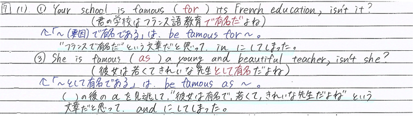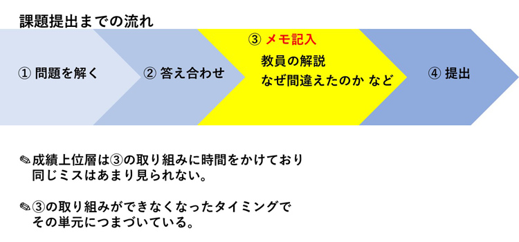 どの教科に限らず,間違えた問題の見直しにどれほど時間をかけるかが重要である。授業では新しい単元を説明後,確認問題に取り組む前にあえて間違いを示す時もある。そうすることで生徒たちは自分たちはどのような間違いをしやすいのかを理解することができ,同時に間違えた際には自ら確認をすることが可能となる。英語が苦手な生徒はついつい間違えた問題を赤で訂正し,そのまま提出することが多いが,上位層の生徒の取り組み方とを比べると成績の伸びに大きな差があった。中学生の内に間違いを自分で正すことのできる力を養うことは必要であることがわかる。