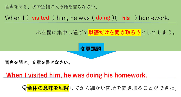 1分ほどの短い対話文や説明文を何度も繰り返し聞き,全て書きだすというディクテーション課題を週1回で課した。空欄補充のディクテーションだと,空欄の語のみに集中してしまうが,全文を書くためには1文を全て聞かなければならない。単語1つ1つで聞き取ろうとしていた生徒たちは,慣れてくると1つの文章で聞き取ろうという音声の聞き方に変化が見られた。また,発音におけるリンキングやリダクションをこの課題を通じて経験することができる。”I’ve been to ~.”という現在完了形の文章を例にあげると,vの発音はほとんど聞こえず,”I been to ~.”のように聞こえる。しかし文法上では主語 I の直後に過去分詞形の been が来ることはあり得ず,生徒たちはディクテーション課題に取り組んでいる中で「聞こえていないけれどもこれは現在完了の文章なのではないか」と推測できる生徒も増えた。課題としてはかなり時間のかかるものではあったが,本校生徒の全国模試の得点率を見るとリスニングは文法の得点率とほぼ同じで,全国推移を超える数値を出すことが出来た。