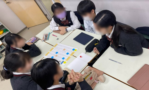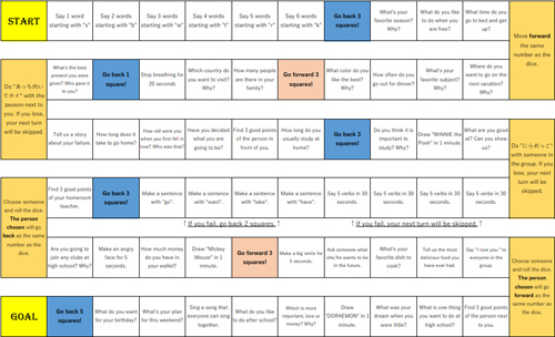 英文法が少しずつ定着し始める中学2年生頃から,アウトプットトレーニングの一環としてオンライン英会話や質問カードを用いたペアワーク,教員が作成したすごろくを用いて発話量を増やす授業も数回実践した。質問に答えるための動詞や目的語を考える時間はかかっている様子ではあったが,生徒たちは自然と必要な時制やフレーズを使えていた。教科書のRead & Thinkは習った単元を自然に使いながら英文に触れることができており,英語にやや苦手意識を持っている生徒でも全体の内容をきっちりと理解できるようになっていたため,ペアワーク時のトークテーマに用いることもできた。