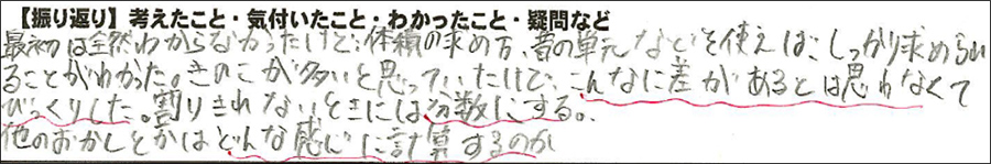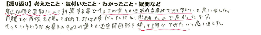 今回の計算の肝である「チョコの体積を求めるためには,クッキーの体積を引いて考えなければならない」ので,「どこまでがチョコか,どこまでがクッキーか」を予想して考えていた。チョコの厚みやクッキーとチョコが刺さっている部分がどれくらいの長さなのかを予想して考えながら図示していたが,実際の問題の図を見てみると「思ったよりクッキーが刺さっている」「意外とチョコの厚みが大きい」など,見えてない部分をどう捉えて表現していくかがカギになっているようだった。