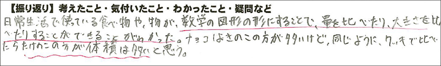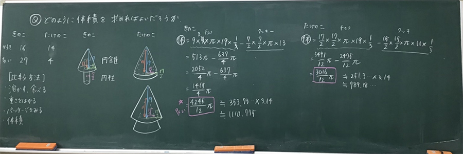 身近なものを数学の世界にある「円錐や円柱」などにモデル化することで,「自分たちの知っている立体にみなして考えると計算できる!」と,びっくりしていた生徒が多数いた。全く同じ形でなくとも「モデル化して考える」ことで比較したり,計算できることで「他のお菓子なら」「クッキーの体積ならどうか」「他の立体に置き換えることはできないか」と,さらに発展して考えることができていた。