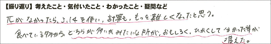 」を習った1年生からすると,1年2章で習った1次式の文字式の計算の「有用性」に気付くことができたようだ。3.14を使って計算していれば,割り切れなかったりさらに複雑な計算になることが多く,①で述べた「分数」と「小数(3.14)」が混在してしまう状況になる。そのため,