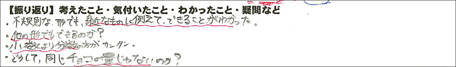 - ・どこまでがチョコで,どこまでがクッキーか,分けて食べてみた経験がないかを問いかけ,イメージして共有部分も修正を加える。