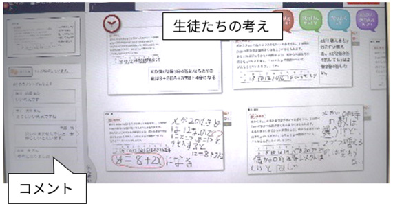 授業ではまず,「ミライシード」の協働学習アプリ「ムーブノート」中のデジタルノートである「私のノート」で,一人一人に課題を提示し,タブレット端末専用のタッチペンやキーボード等の様々な方法で,自分の考えを書き込ませた(資料4)。その後,共有スペースである「みんなの広場」に自分の考えを送信させた。生徒たちは,自分で考えたことを図や式や言葉で表現し,言語活用能力が向上した。図には様々な着色もできるため,分かりやすく表すことができた。また,「みんなの広場」では,瞬時に多くの友達の考えを確認することができた。そのことで生徒は,一つの課題に対して,様々な考え方があることを知り,多様な数学的な見方・考え方を働かせることができた。その際,他の生徒の解答に共感したり,コメントを書き込んだりする機能も活用し,タブレット端末内で意見交換させることができた(資料5)。また,課題に対する練り合いをスムーズにさせるために,グループ活動を取り入れた(資料6)。その後は,その場で自分の意見を発表させたり,前面のホワイトボードに自分の解答を大きく映し,前に出て発表させたりした(資料7)。