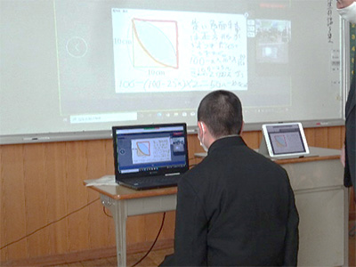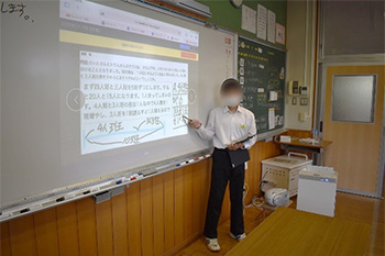 本校の普通教室は,黒板をホワイトボードに変え,プロジェクターを備えた電子黒板として利用している。数学科では,ほぼ毎時間デジタル教科書を使用して授業を行っている。デジタル教科書(啓林館「未来にひろがる数学」)は,生徒が使っている教科書をそのまま投影できるだけではなく,問題のところどころにフラッシュカードが組み込まれ,それを活用して,効果的に話し合い活動等を行い,習熟させることができる(資料1)。