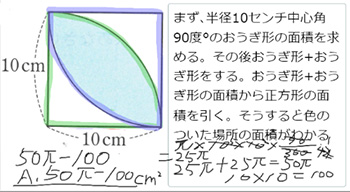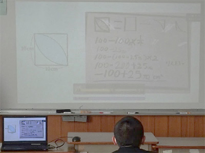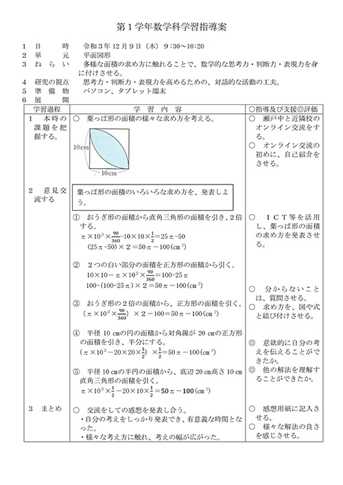 本校の生徒は「ミライシード」の「ムーブノート」を活用した。葉っぱ形の面積の求め方を図,言葉,式で表し,Zoomの「画面共有」を使って発表した(資料13)。近隣校の生徒は,ホワイトボードに求め方を書き表し,それをプレゼンテーションソフトの「Microsoft PowerPoint」に画像として貼り付け,「画面共有」を使って発表した(資料14)。