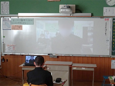 今回の授業では,両校の教員用のパソコンのみをZoomで結び,討論形式で授業を展開した。前面のホワイトボードに両校の教室の様子が分かるように提示し,プロジェクターから音声を流した。
