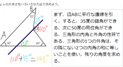 本時後半の星形五角形の先端にできる五つの角の和については,ヒントカードを生徒に提示した(資料22)。デジタルばかりでなく,リアルでも有効な教材は多く,組み合わせて使用している。そして,タブレット端末に専用のタッチペン等を使用したり,タイピング入力したりしながら解法を記入させた(資料23)。この問題に関しても,本校の生徒にはない解法が近隣校から出され,多様な数学的な見方・考え方に触れることができた(資料24)。