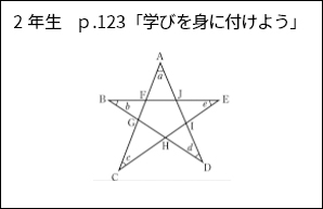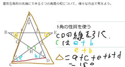 本校の生徒だけでも五つの解法が出たが,近隣校からは,別の解法が発表され,本校の生徒は,その発表を興味深く聞いていた。資料21にあるように,発表する場合は,パソコンの前に来て行った。その際,相手校の画面にはどうしても顔が暗く映ってしまうため,専用の照明器具を用意した。また,テレビ画面には,パソコン画面のGoogleミートの画面を,前面のホワイトボードには,ムーブノートの「みんなの広場」のそれぞれの解法を映し出して,授業展開した。 ブーメラン型の角度について論理的に説明し合うことは,思考力・判断力・表現力等を高めるだけでなく,次の星形五角形の先端にできる五つの角の和について考える際に働かせる数学的な見方・考え方の一助となる。つまり,星形五角形の角の性質を考える足掛かりとなる。