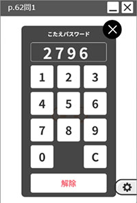 本実践では,学習者用デジタル教科書の各問題にある「解答」機能を利用する。この機能を選択すると「こたえパスワード」を求められる(図2)ため,授業者は指導者用デジタル教科書からパスワードを表示し,大型提示装置や板書等で生徒に示す。(図3・図4)一時的に見せたい場合は,大型提示装置を用いるが,通常は前述の(1)と近い運用を想定しているため,答えパスワードを板書していつでも生徒が解答を確認できるようにしている。