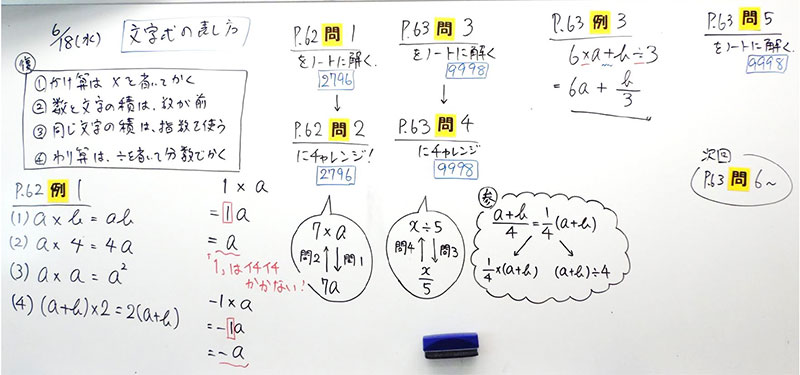 本実践では,文字式の表し方のルール「①かけ算は×を省いてかく,②数と文字の積は数が前,③同じ文字の積は指数を使う,④わり算は÷を省いて分数でかく」を前時で学習したため,その練習のため教科書の問いを用いた学習を行った。この授業では,×や÷を使って表された式からルールを適用した式をかく「問1」と「問3」をメインとして取り上げた。この2つの問いが自力で解けた生徒は,ルールに従って表された式から×や÷を用いた式をかく「問2」や「問4」に取り組むという流れで行った。本実践を行ったクラスの生徒の実態として,上位の生徒は比較的自力でこれらの問いに取り組むことができるが,下位の生徒は文字が複数出てきたり,負の符号が出てきたりすると途端にわからなくなってしまうことがある。そのため,自らのペースで学習できる生徒には,「教科書62ページの問1と63ページの問3をノートに解き,デジタル教科書で答え合わせをしよう。それが終わったら,問2と問4をノートに解き,デジタル教科書で答え合わせをしよう。」と指示を出し,図5のように板書で示した。一方,自力で解くことが難しい生徒には,筆者と特別支援教育支援員(以下,支援員)が個別にフォローに入り,一緒に解いたりヒントを提示したりしながら,問1と問3に取り組ませた。