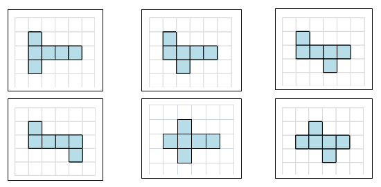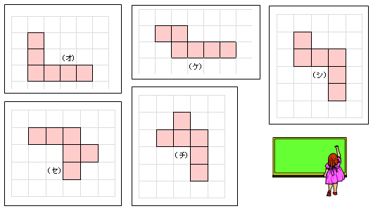 横に5つ並んではいないが,組み立てたとき同じ面に2つ重なってしまうもの(オ)(ケ)(シ)(セ)(チ)![]() |