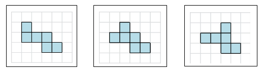 一番長い横の列に3つ並ぶタイプ。その上に1つ,その下に2つ正方形がつく。一番上につく1つの正方形の位置を変えると3種類の展開図が得られる。