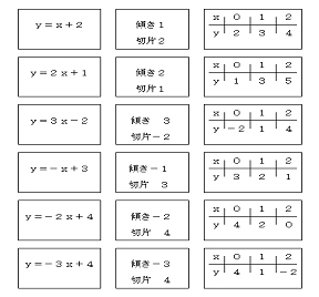 したがって,最後がきちんと1枚になることがグループの勝利であることを確認してからゲームに入った。 やみくもに手元にある11~10枚のカードを見ても,なかなか同じ関数は見つからない。そこで,「切片と傾き,どちらがすぐにわかるかな」と生徒に聞く。すると生徒は,「切片」とこたえる。なぜなら,表の傾きは,頭の中できちんと計算しないとわからないからである。