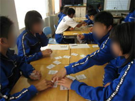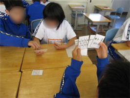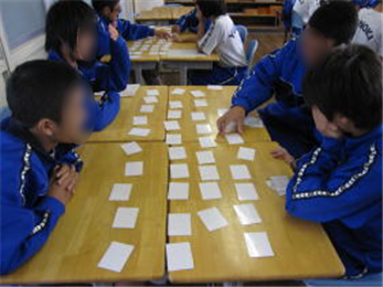 生徒は,これまで神経衰弱・ジジ抜きを通して仲間と確認しながらゲームを行ってきたので,カルタを間違えることなく,とてもスムーズに行うことができた。4人グループで行ったが33枚ある取り札を1枚もとれない生徒はこれまでいなかった。数学を苦手にしている生徒でも毎回確実にカードを手にしていた。生徒は,仲間シートを見ることがなくなり,身を乗り出して真剣にゲームに参加した。