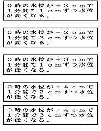 0時から x分後の基準点から水位を ycmとする設定で1次関数トランプと同じ関数になるようにカードを11枚作った。そして,式・用語・表・グラフというカードを1枚ずつ作り,優勝を決定する際には,式・用語・表・グラフから教師が1枚選び,その後,11枚の文章カードから1枚選んだ。