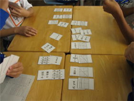 1次関数トランプの最後のゲームとしてカルタを行った。グラフトランプ11枚を読み札にして,式・表・用語トランプ合計33枚を取り札とした。教師が,教材提示装置をつかって読み札であるグラフトランプを提示し,その関数と同じ式・表・用語の3枚のトランプを見つけた。