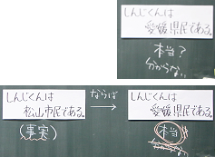 例:「しんじくんは愛媛県民である。 →ならば→ しんじくんは松山市民である。」
