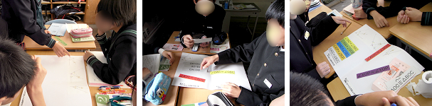 グループになって,カードを移動させながら,「こっちか?」「どっちだ?」と話し合いながらグループに分けていく。