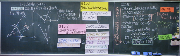 OA=OB,OC=OC,AC=BCはどの班も左に置くことができた。△AOC≡△BOCを左に置いている班が出ているので,全体で取り上げる。