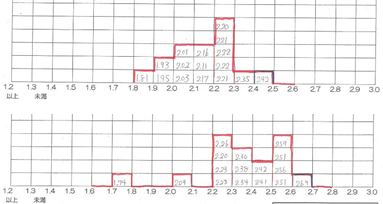 T「一番出た回数が多いところに目を向けたんですね。5班の場合はそれが1.7秒~1.8秒と2.3秒~2.4秒だったのですね。これだとどうなるか,皆さんも確かめてみましょう。一番ヒストグラムの高いところに,赤ペンで山形に印をつけましょう。これ(黒板に掲示している6班のデータ)でいくとここですね。はい,自分のデータを見て,赤ペンでかきこんでみてください。」 T「ここの班は1ヶ所だったけど,ここの班は2ヶ所ありました。2ヶ所だった班は,手を挙げて。何班かありますね。この場合はどう考えたらよいのでしょうか。東さんどうですか。」 |