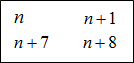 正方形の左上の数をnとすると,残りの3つの数は右の表のように表される。対角にある数の積の差は,